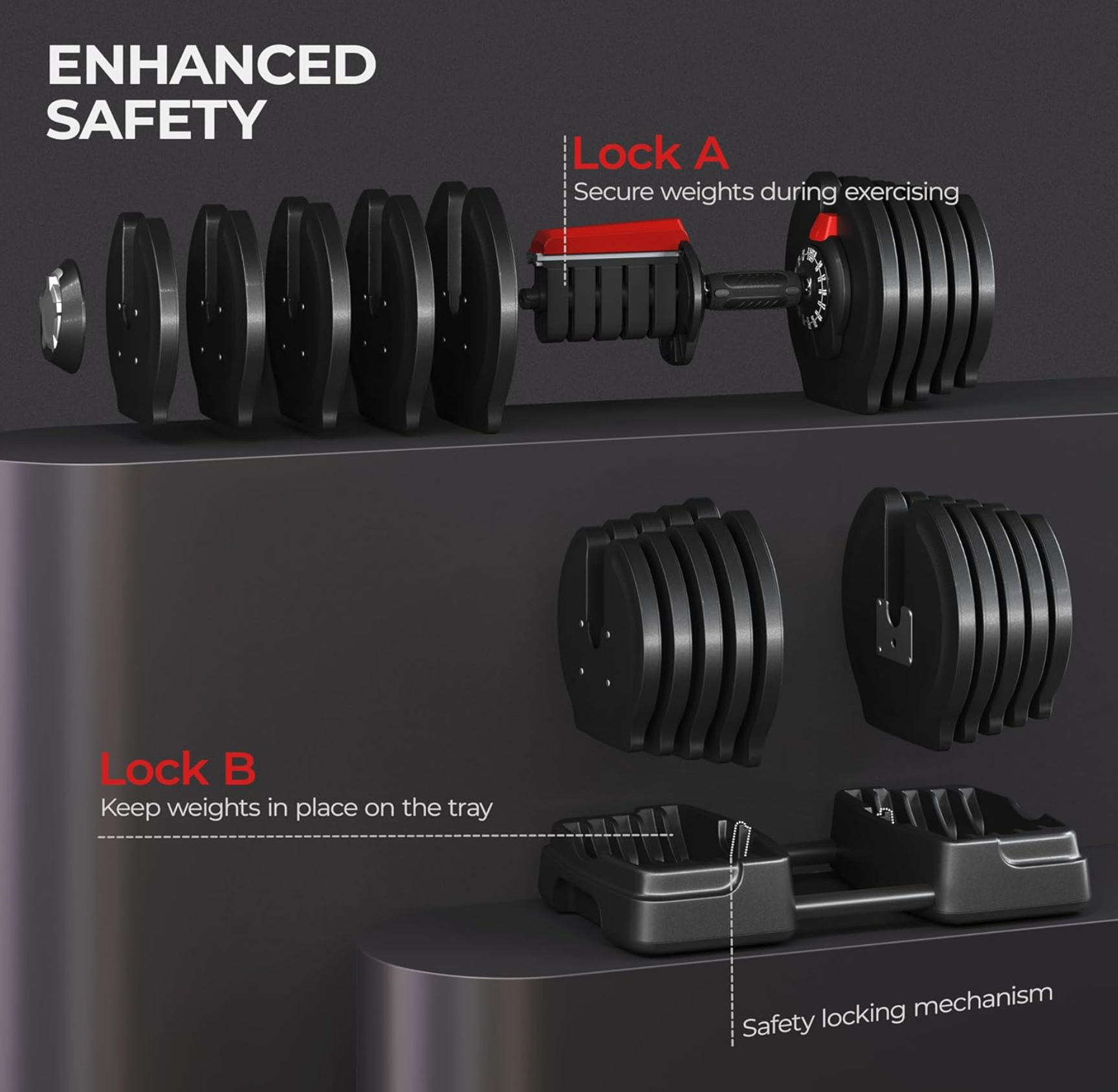 Safety is a top priority with the OX 40KG Adjustable Dumbbell & Barbell. The dual safety lock mechanism ensures that the weights remain securely in place during your workouts. The weight adjustment is activated only when the dumbbell or barbell is securely on the tray, eliminating the risk of accidental operation. This feature provides peace of mind, allowing you to focus on your training without any worries.